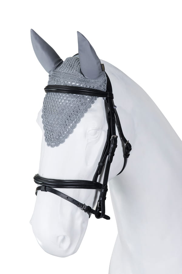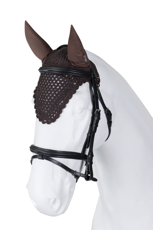 Especially recommended for sensitive and less experienced horses. Protect from insects and muffle sounds while riding. Handmade from fine cotton yarn, finished with decorative stitching.